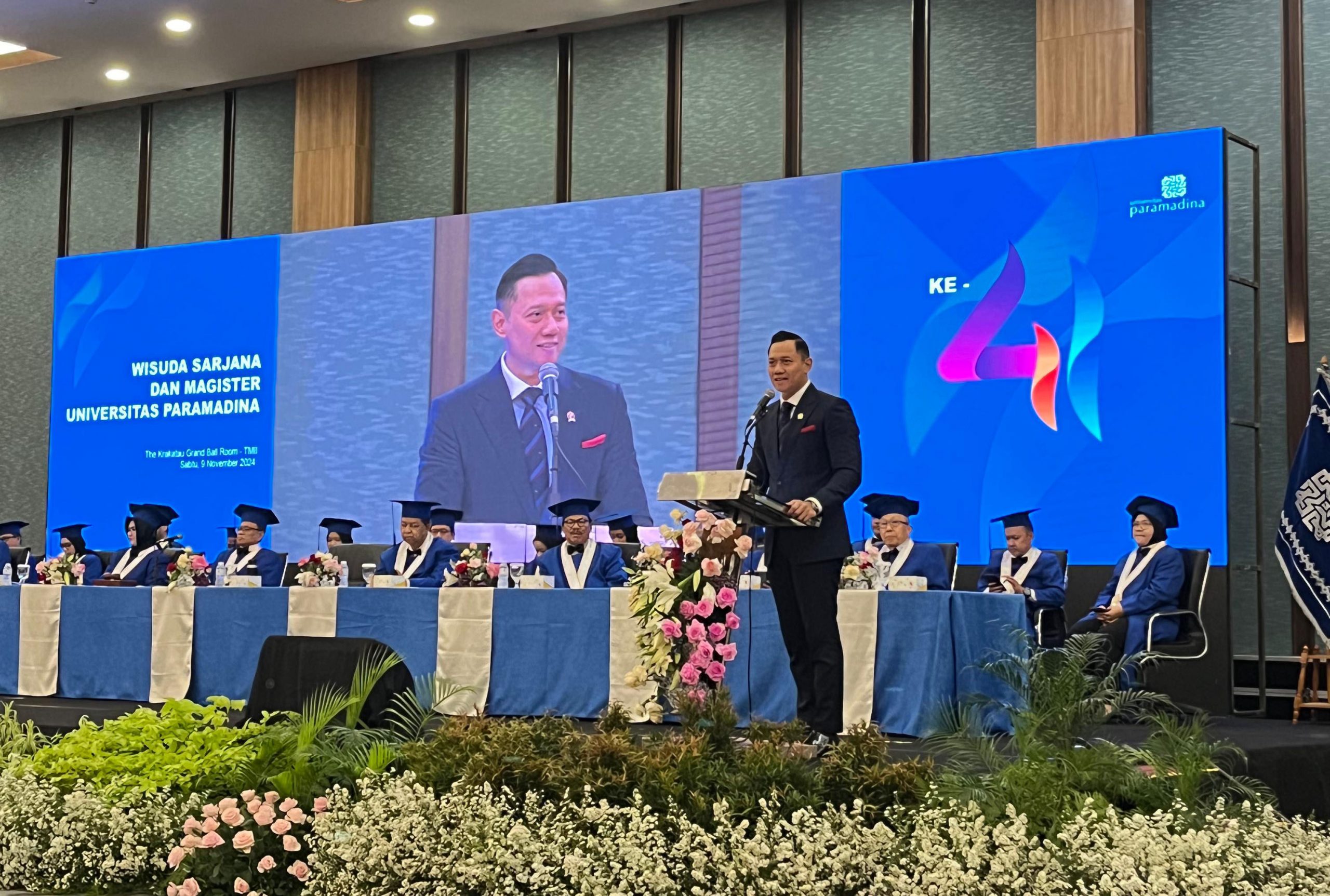BENTARARAKYAT.COM | Jakarta – Wisuda Sarjana dan Magister Universitas Paramadina ke-41 kali ini turut hadir Menko Infrastruktur dan Pembangunan Kewilayahan RI, Agus Harimurti Yudhoyono (AHY) yang diselenggarakan Sabtu (9/11/2024) di Krakatau Grand Ballroom, TMII, Jakarta.